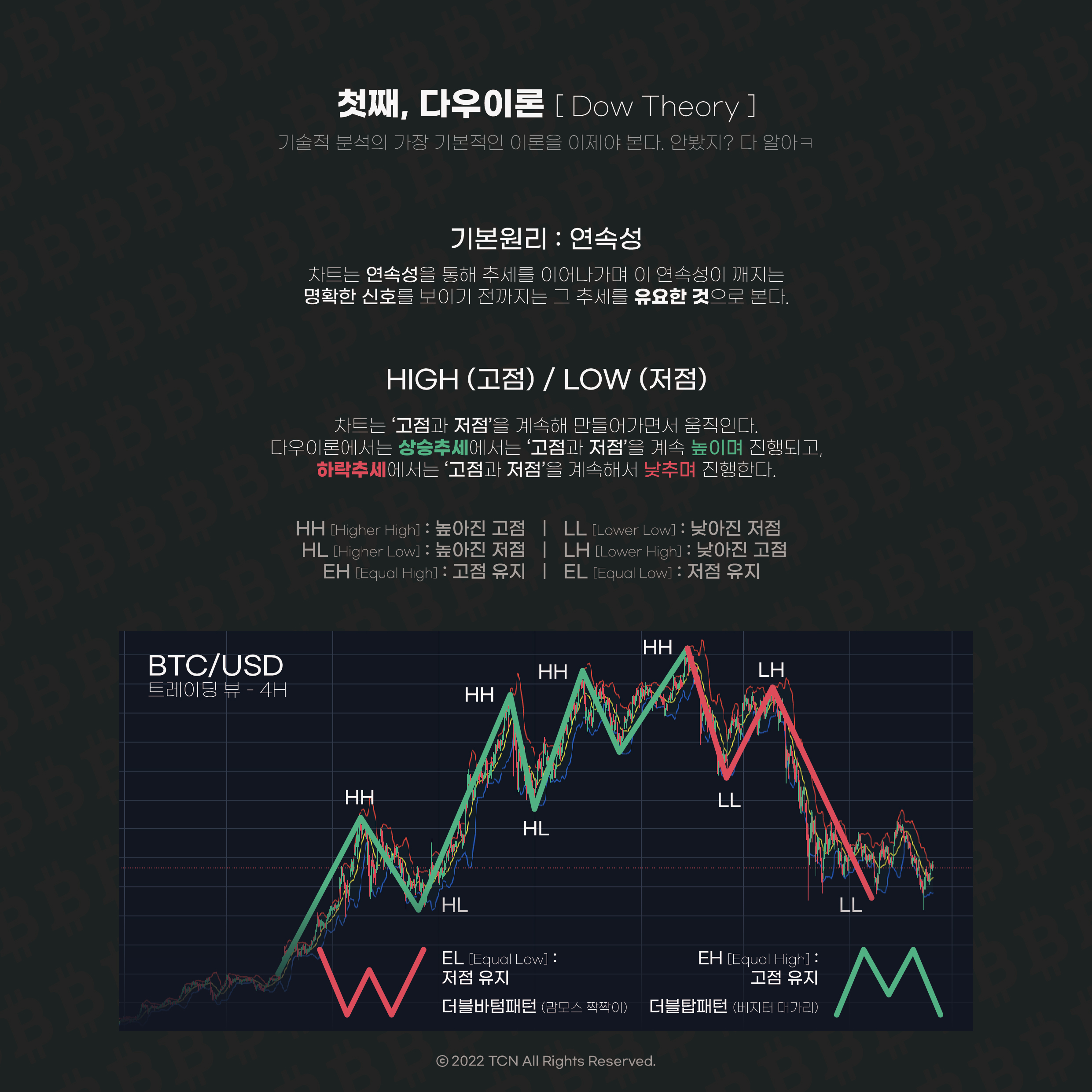고점과 저점을 번갈아 높이면서 상승트렌드를 만들고 고점과 저점을 낮추면서 하락트렌드를 만들며,